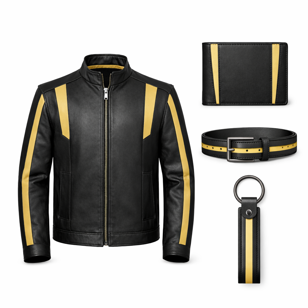 This men’s black and sand gold leather outfit set is designed for everyday wear, offering a bold yet refined contrast look with clean detailing. The set includes a stand-collar leather jacket paired with a matching wallet, belt, and keychain, all coordinated in black with sand gold accent panels for a cohesive and modern appearance.