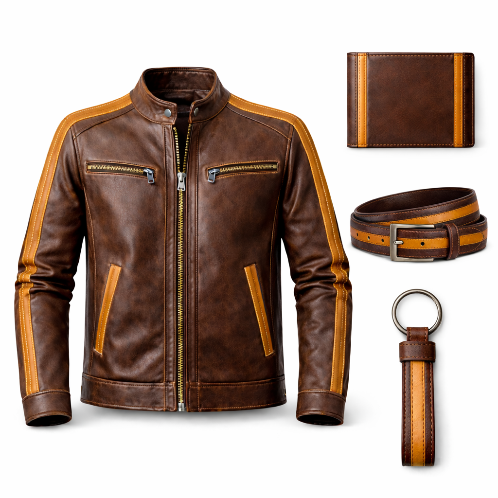 This men’s brown leather outfit set is designed for everyday wear, featuring a rugged yet refined look with contrast detailing. The set includes a stand-collar leather jacket paired with a matching wallet, belt, and keychain, all coordinated in brown leather with tan accent stripes for a bold and cohesive appearance.