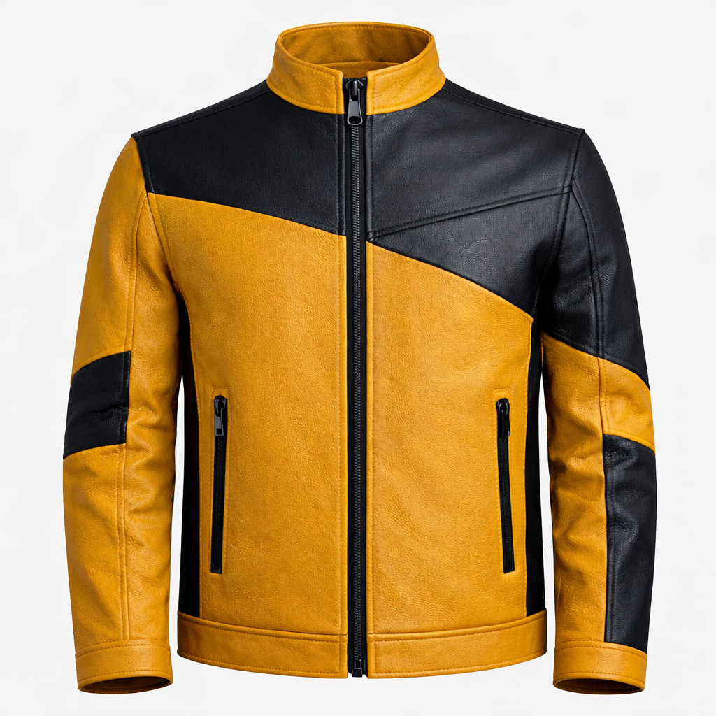 1 × Men’s Mustard & Black Leather Stand Collar Jacket