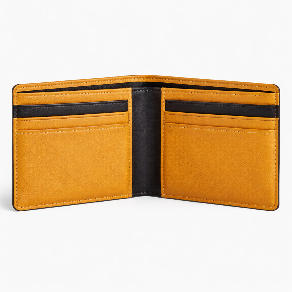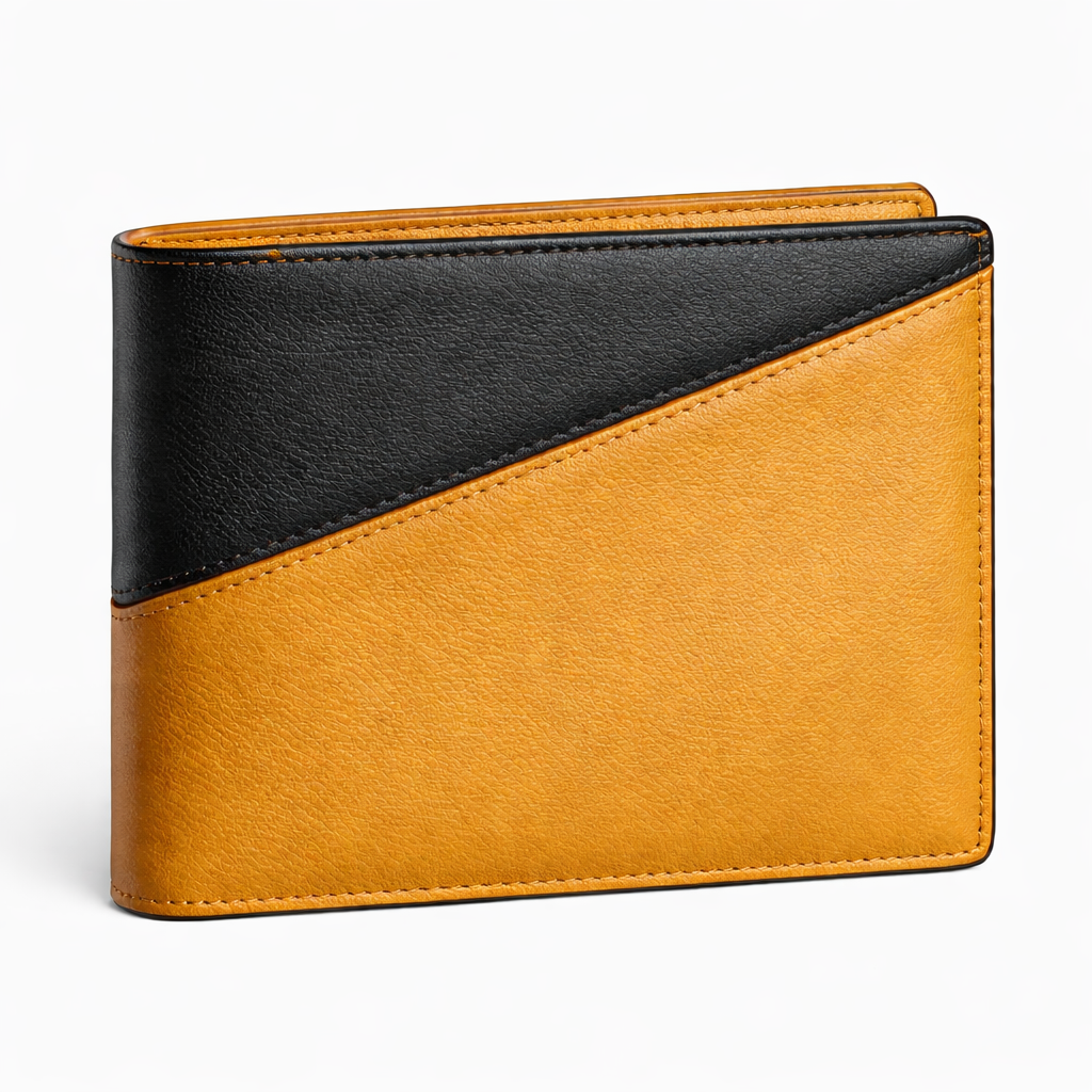 This men’s mustard and black leather outfit set is designed for everyday wear, offering a bold color-block look with a clean and modern finish. The set includes a stand-collar leather jacket paired with a matching wallet, belt, and keychain, all coordinated in mustard and black tones for a strong and cohesive appearance.