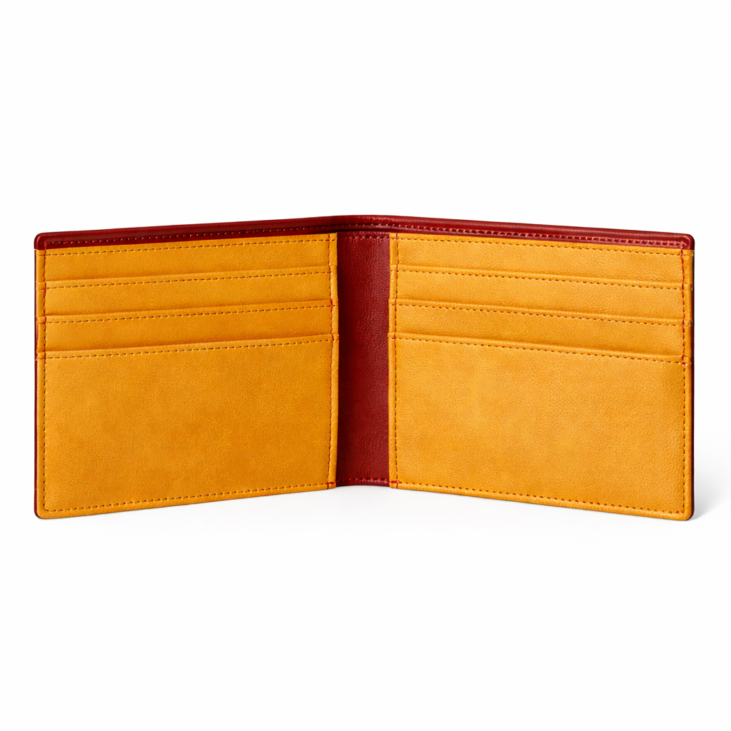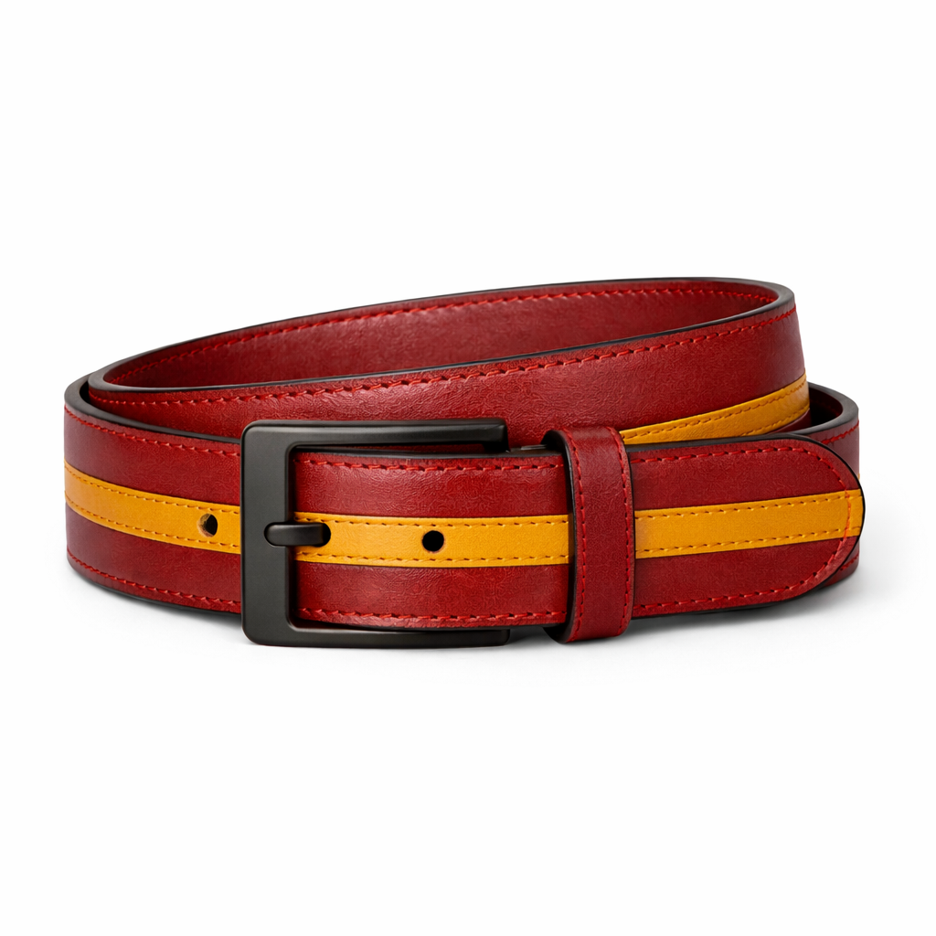 This men’s red and mustard leather outfit set is designed for everyday wear, offering a bold two-tone look with clean and modern styling. The set includes a leather jacket paired with a matching wallet, belt, and keychain, all coordinated in red and mustard tones for a strong and cohesive appearance.