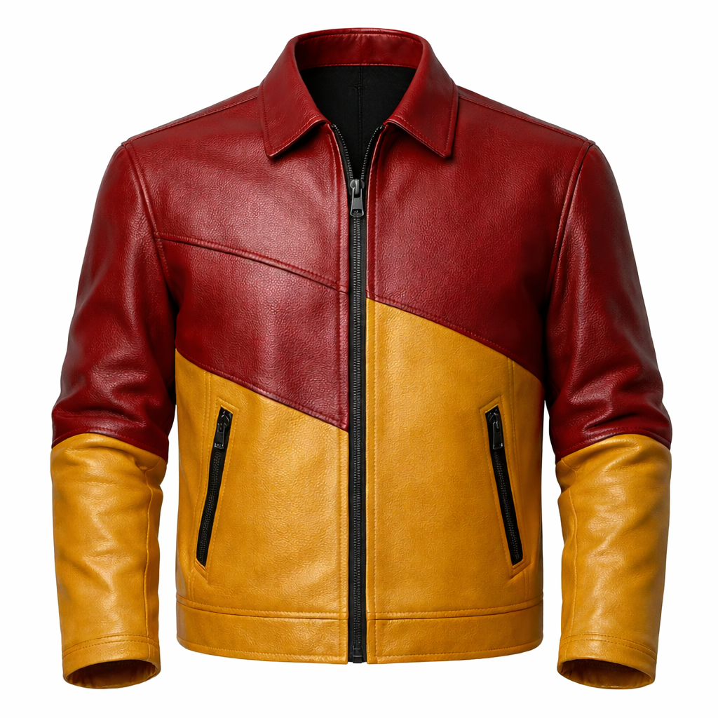 The leather jacket features a structured collar, front zip closure, and functional zippered side pockets. The diagonal color-block design in red and mustard adds a distinctive visual element while maintaining a balanced and wearable style. Its smooth leather finish and comfortable inner lining make it suitable for daily use in mild to cool weather. The matching leather accessories complement the jacket, completing the set with a practical and coordinated finish.