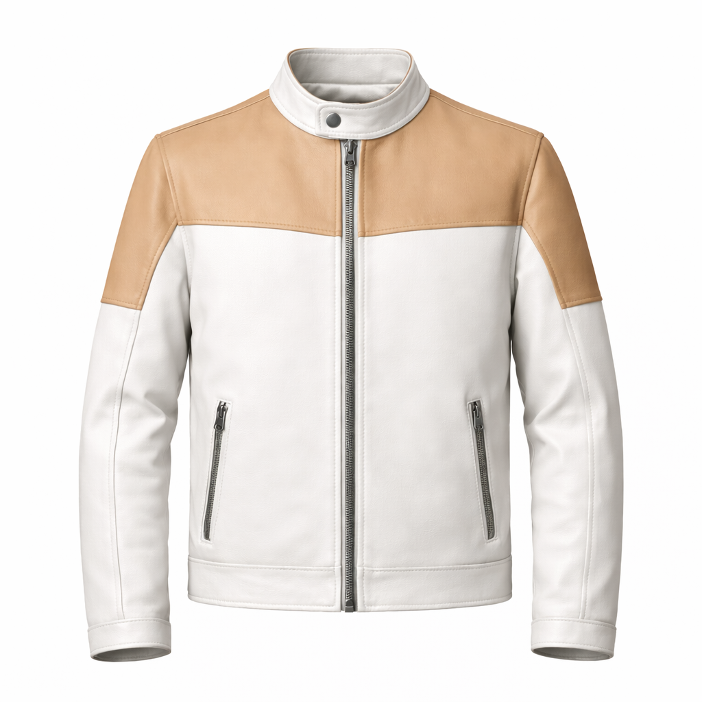 1 × Men’s White & Tan Leather Stand Collar Jacket